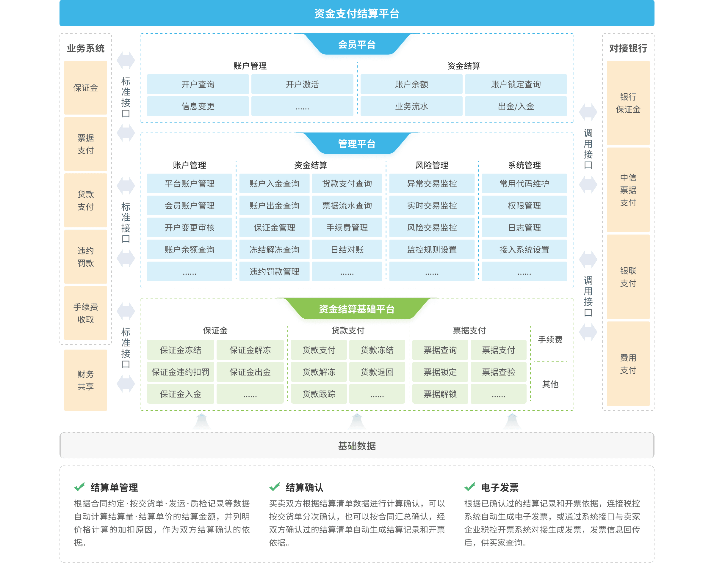 資金支付結(jié)算平臺主要分為資金管理端、銀行接口端、業(yè)務(wù)接口端三大部分。資金管理端主要實現(xiàn)平臺會員的賬戶信息管理、會員認證審核、會員權(quán)限管理、會員出入金管理、保證金凍結(jié)解凍、收支流水管理、貨款及費用支付管理、財務(wù)相關(guān)報表查詢及管理和資金風(fēng)險監(jiān)控管理等功能。