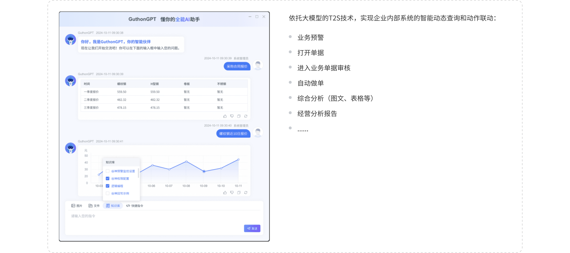 應(yīng)用場(chǎng)景1:業(yè)務(wù)信息智能查詢 通過日常交流語言即可實(shí)現(xiàn)企業(yè)內(nèi)部數(shù)據(jù)的查詢、分析和可視化展示。