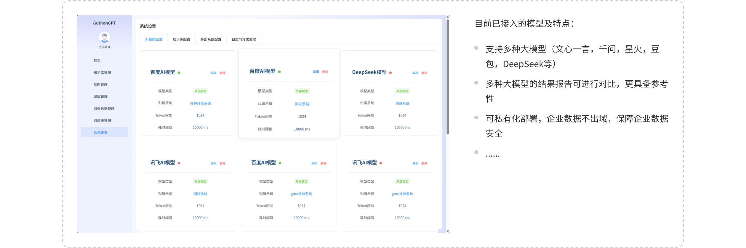 應(yīng)用場(chǎng)景6:大模型聚合 支持多種大模型接入,形成聚合平臺(tái),可動(dòng)態(tài)切換模型,反饋的報(bào)告結(jié)果可對(duì)比可參考。