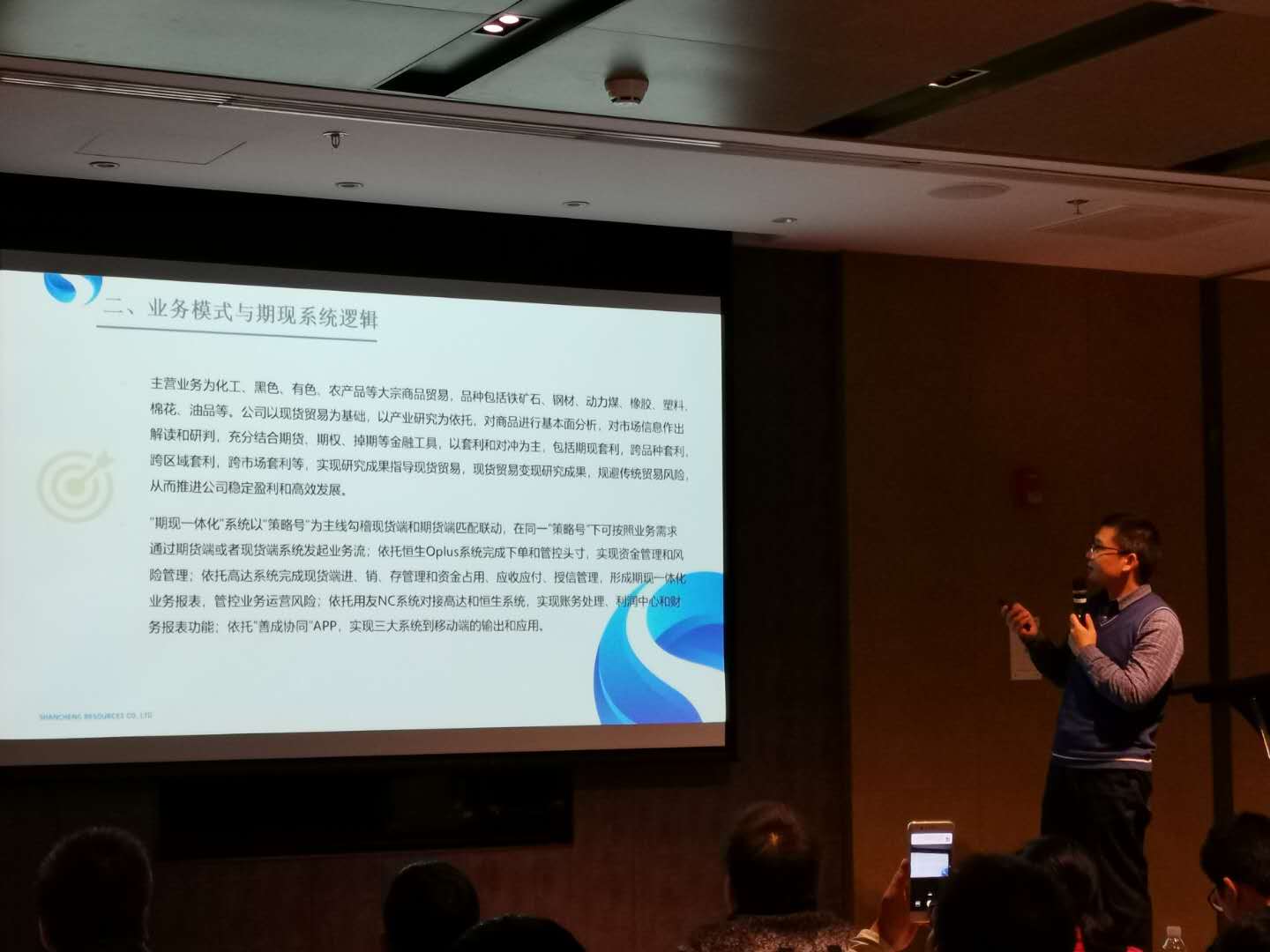 善成資源副總經(jīng)理劉剛先生分享了善成資源的風險管理信息化經(jīng)驗,劉總著重講解了“期現(xiàn)一體化“的管理思路,即以“期現(xiàn)交易策略號“為主線進行現(xiàn)貨端和期貨端的匹配聯(lián)動,實現(xiàn)期現(xiàn)風險敞口的全流程跟蹤管控和浮動盈虧實時展現(xiàn)預警。高達期現(xiàn)風險管理系統(tǒng)在”策略號”下按照實際業(yè)務(wù)通過期貨端或者現(xiàn)貨端系統(tǒng)發(fā)起流程管理,系統(tǒng)集成和同步了恒生證投的Oplus系統(tǒng)完成下單和頭寸管理數(shù)據(jù),實現(xiàn)期貨端的資金和頭寸的價格和盈虧管理,并把現(xiàn)貨端的授信管理、采購管理、銷售管理、庫存管理、價格管理、資金管理、票據(jù)管理、費用管理、成本管理、現(xiàn)貨端的建倉平倉利潤管理和權(quán)益頭寸的浮動盈虧管理,深入分解到軟件系統(tǒng)中流程管理的制單、法務(wù)、風控、財務(wù)和審計管理的各個節(jié)點和角色,根據(jù)權(quán)限實現(xiàn)期現(xiàn)風險的事前授信,事中有效和實時管控、事后能追溯和復盤的期現(xiàn)業(yè)務(wù)一體化風險管理體系;并通過標準憑證接口形成業(yè)務(wù)財務(wù)一體化系統(tǒng);他表示,善成資源的信息化實踐是站在永安、高達和恒生等行業(yè)巨頭的肩膀上,結(jié)合善成資源的實際需求,做了一次公司層面和行業(yè)意義的真正期現(xiàn)結(jié)合的信息化探索,是信息化系統(tǒng)與善成資源內(nèi)部期現(xiàn)管理思想和需求的一次深度融合,是公司經(jīng)營管理的一次巨大創(chuàng)新。