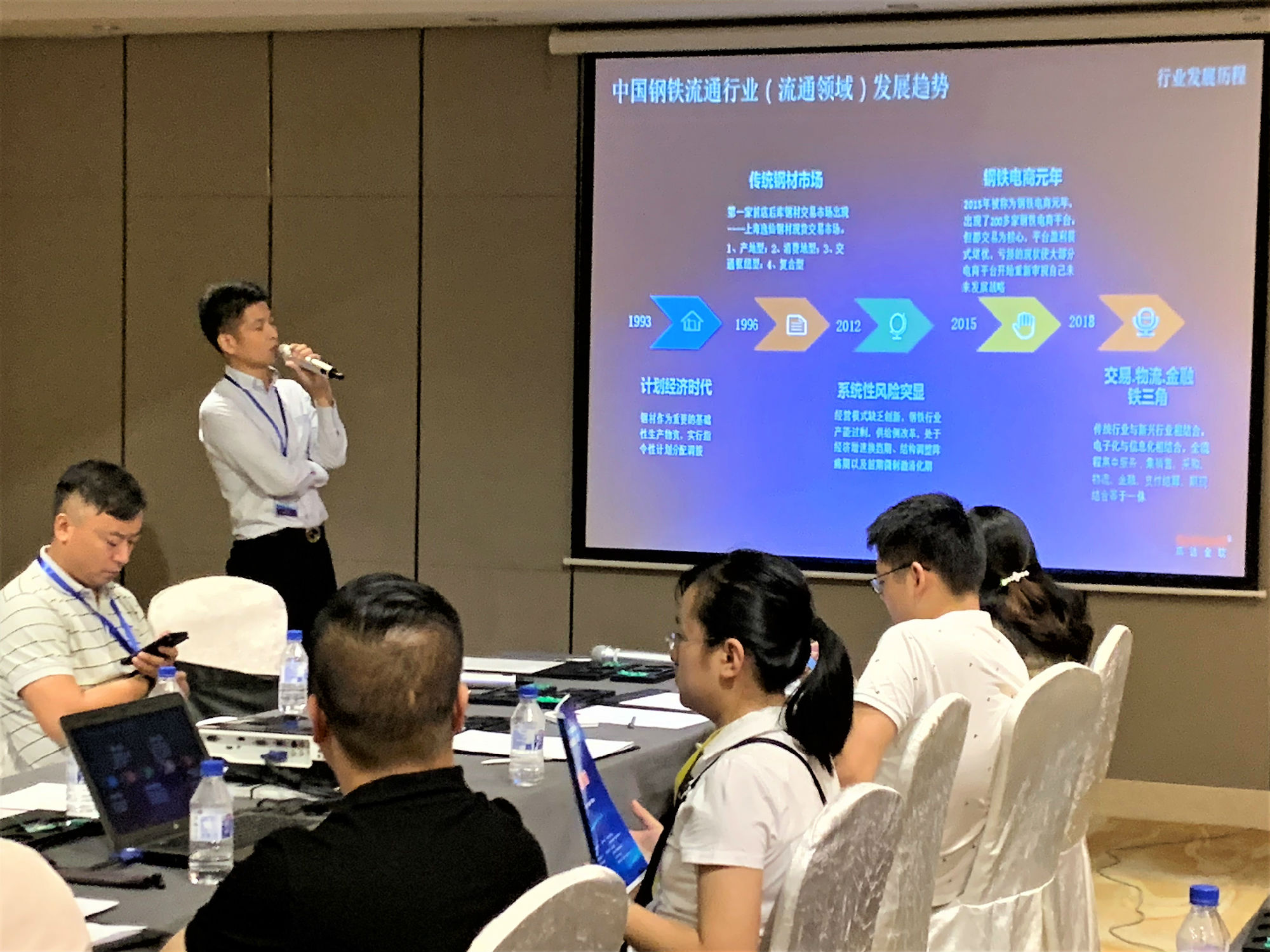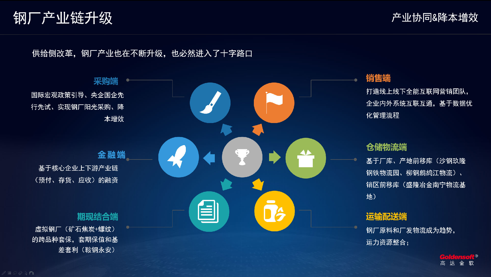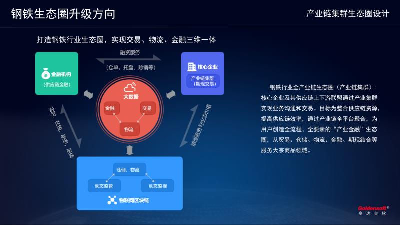 演講中,胡總提出了鋼鐵行業(yè)全產(chǎn)業(yè)鏈集群的構(gòu)思,助力打造鋼鐵行業(yè)數(shù)字供應(yīng)鏈生態(tài)圈,核心企業(yè)及其供應(yīng)鏈上下游聯(lián)盟通過產(chǎn)業(yè)集群實現(xiàn)業(yè)務(wù)溝通和交易,實現(xiàn)交易、物流、金融三維一體。目標(biāo)為整合供應(yīng)鏈資源,提高供應(yīng)鏈效率,通過產(chǎn)業(yè)鏈全平臺聚合,為用戶創(chuàng)造全流程、全要素的“產(chǎn)業(yè)金融”生態(tài)圈,從貿(mào)易、倉儲、物流、金融、期現(xiàn)結(jié)合等服務(wù)大宗商品領(lǐng)域。