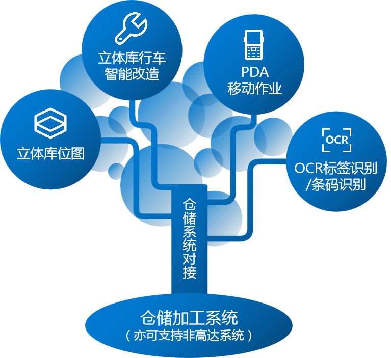 高達虛擬立體庫體系包括:倉儲系統(tǒng)對接、立體庫位圖、立體庫行車智能改造、PDA移動作業(yè)、OCR標簽識別/條碼識別等組成部分。其中倉儲加工平臺亦可支持非高達系統(tǒng),實現(xiàn)“虛擬立體庫”可不必更換系統(tǒng)平臺。